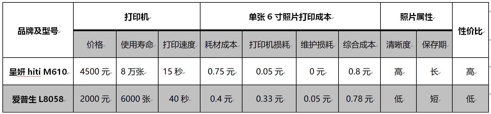 出于商業運營角度考慮,多數圖文店、照相館老板在開展快照業務時,往往會在熱升華照片打印機和噴墨打印機打中做選擇,今天我們以呈妍hiti M610和和愛普生L8058(使用原裝墨水)為例探討分析兩者的性價比,如下表所示: